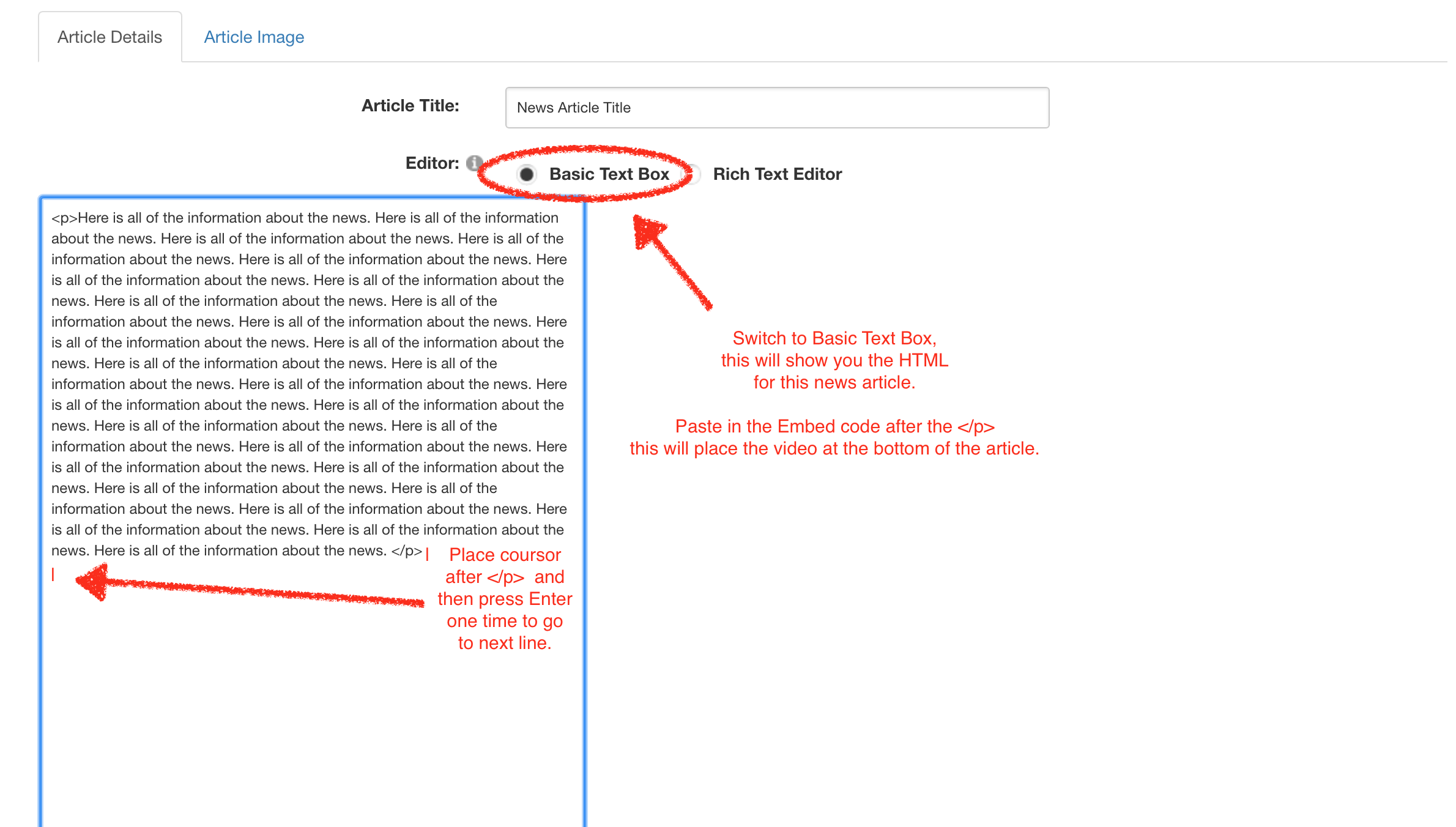 5. Place your cursor at the end of the text and Enter to the next line. Paste in the embed code, then switch back to Rich Text Editor view, and press Save/Publish/Update Article and you will now see the video.